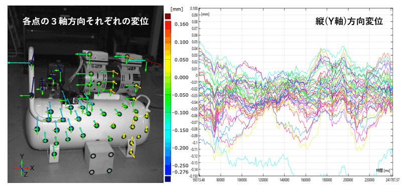 しかし、様々な制約から対象への塗装が難しい場合もあります。そのような際でも、マーカーシールを任意の場所に貼り付けるだけで、その変位量を3次元で取得可能な画像計測技術「ポイント計測」がお役にたてるかもしれません。