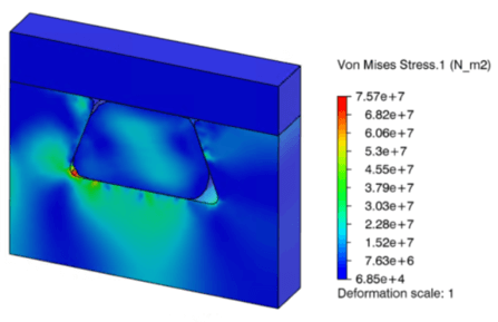 VonMises応力の最大値は 7.57e + 7 N/ で、降伏値 2.068e + 8 N/より小さい値です。