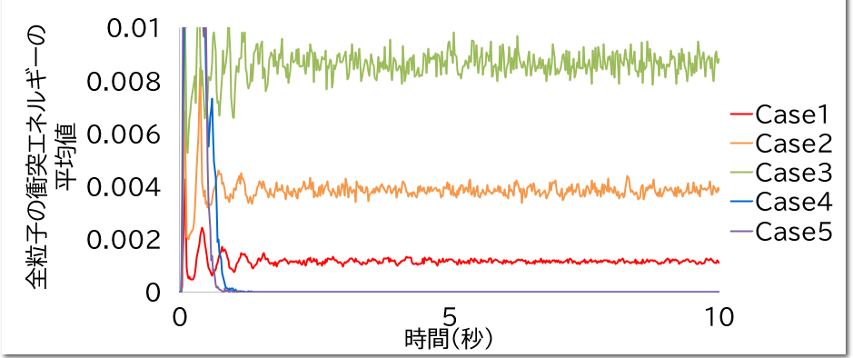 粒子が壁面に張り付くまでのCase1~Case3では、徐々に全粒子の衝突エネルギーが増大していく様子が見られます。