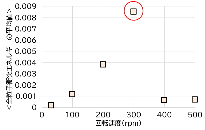 実際に回転速度が上がるにつれて衝突エネルギーの時間平均値が上昇していくことが確認できました。