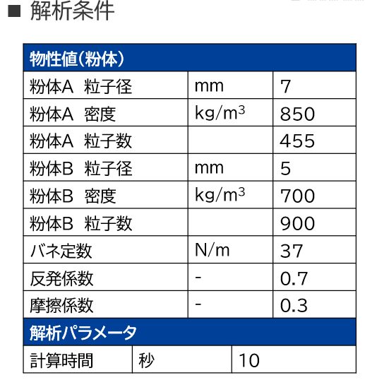 今回はあまり考慮できなかった装置形状や、粒子形状、その他にも付着力や液架橋力といった粉体パラメータを考慮したシミュレーションも可能です。