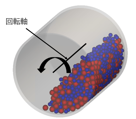 回転速度30rpm(※1分間に30回転)での粉体挙動をシミュレーションし、可視化します。