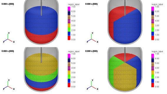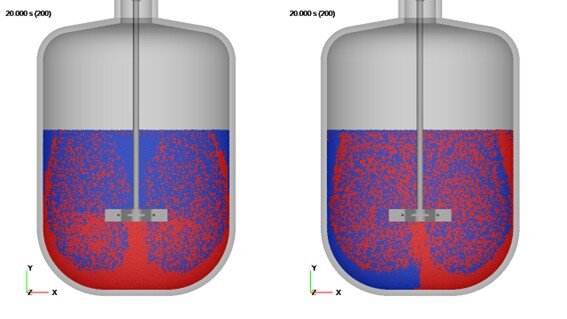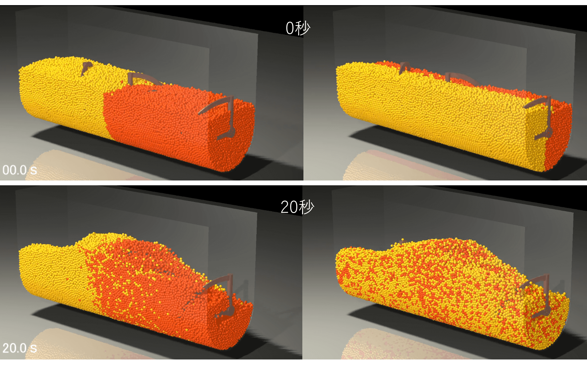 混合度の差がわかりやすい2分割の解析結果を図 4に示します。上下2分割では、初期に上側にあった成分(青)が依然として上部に偏在している様子がわかります。一方、円周方向2分割では、壁面近傍こそ赤青の成分が残るものの、容器中心部は比較的混合が進展していることがわかります。