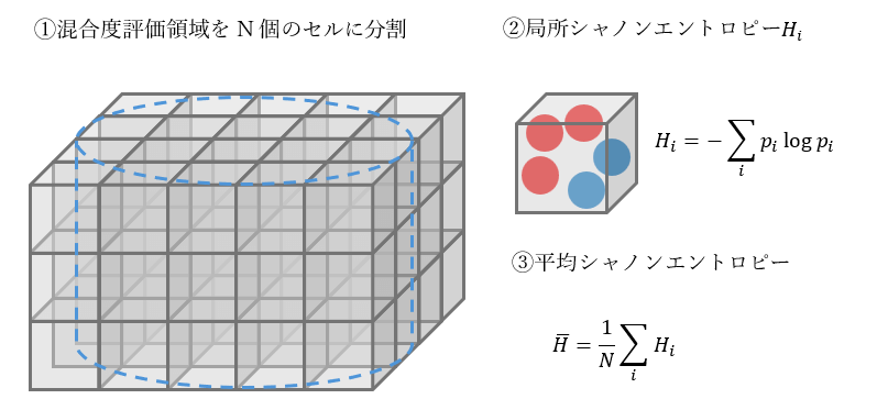 今回は、次の手順でシャノンエントロピーによる混合度評価を行いました。