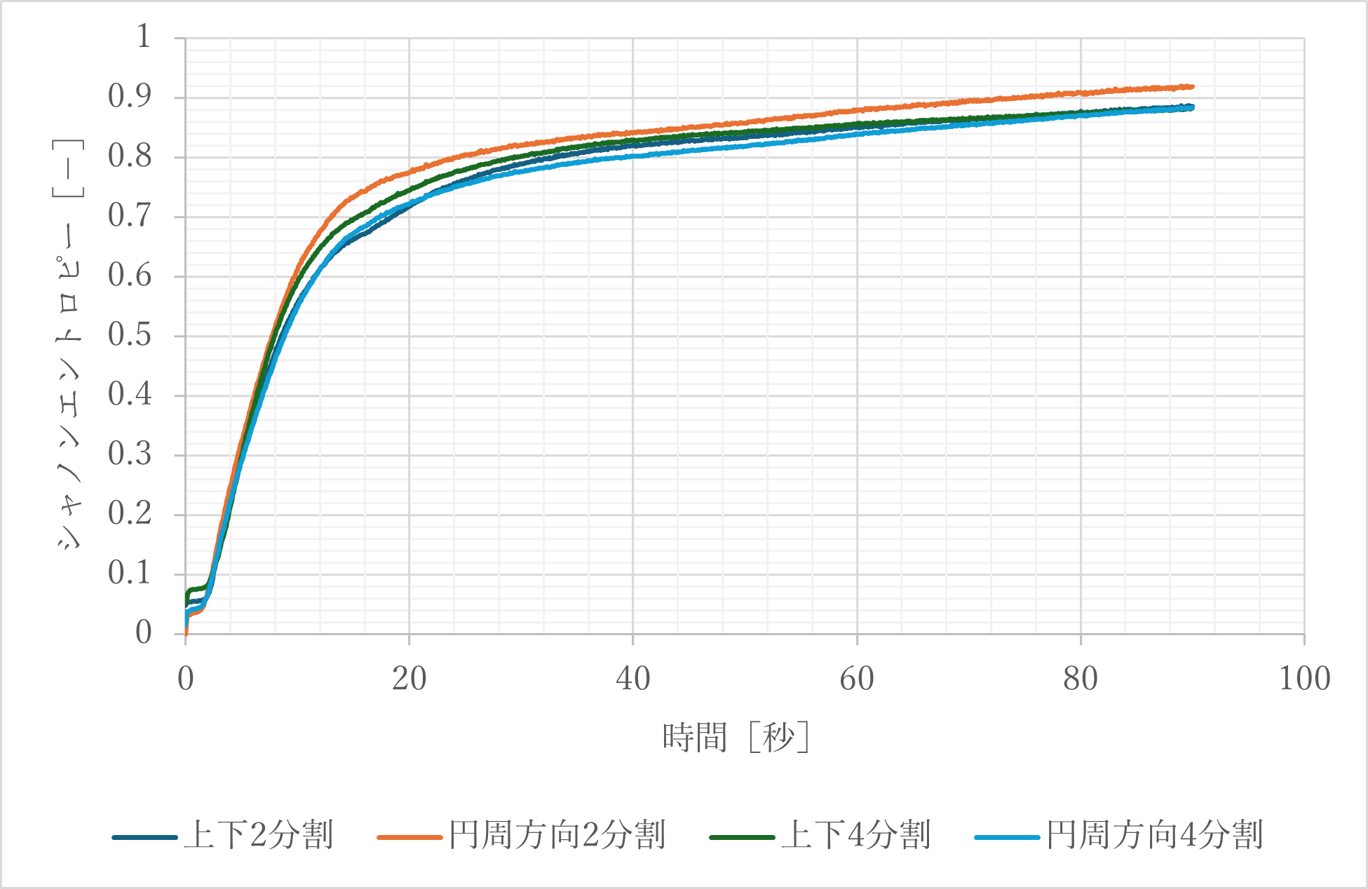 この差は平均シャノンエントロピーの差にも表れます。図 5に平均シャノンエントロピーの時系列変化を示していますが、上下2分割の結果の方が、平均シャノンエントロピーが低いことが確認できます。
