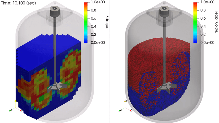 少し発展的な混合評価方法になりますが、局所的なシャノンエントロピーを可視化した結果を図 7に示します。これまでの評価は平均値を使用した評価でしたが、局所的なシャノンエントロピーを可視化することで、未混合領域を可視化することが可能になります。このような評価を行うことで、詳細な混合状態の評価ができるようになるかと思います。
