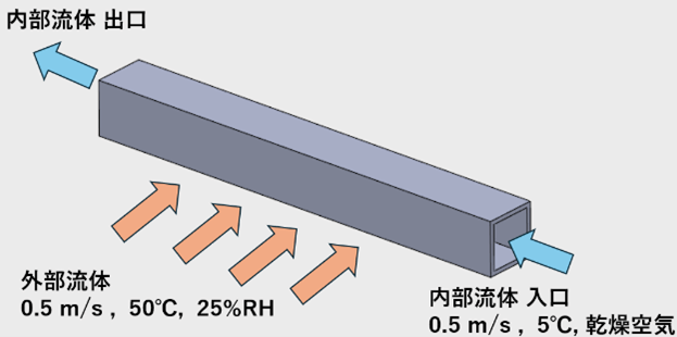 配管内を低温の流体が流れ、配管外は高温の湿った空気が流れている環境を想定したシミュレーションを簡易形状で実施し、配管外壁に発生する結露の厚さを確認した。