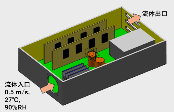 SOLIDWORKSと連携が可能な3DEXPERIENCEの熱流体解析ロール「Fluid Dynamics Engineer」を用いた結露解析の例を下記に示します。