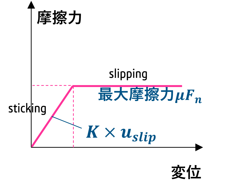 理想的なクーロン摩擦の定式化は「0か1か(動くか動かないか)」という不連続な世界ですが、ペナルティ法を導入することで、これを「硬いバネの変形」という連続的な物理現象に置き換えて計算可能にしています。