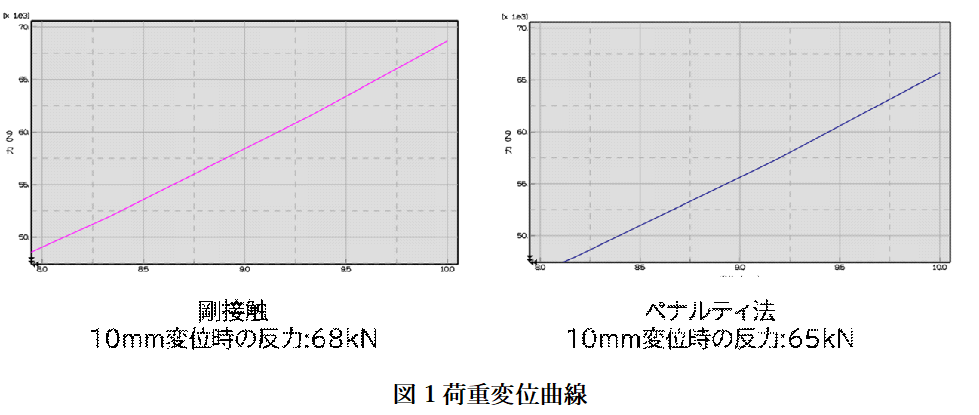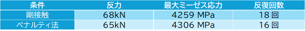 このことから、モデル全体の「硬さ」の評価にはわずかな差が出たものの、応力が最も集中する箇所の局所的なふるまいは、ペナルティ法でも剛接触と遜色なく捉えられていることが分かります。