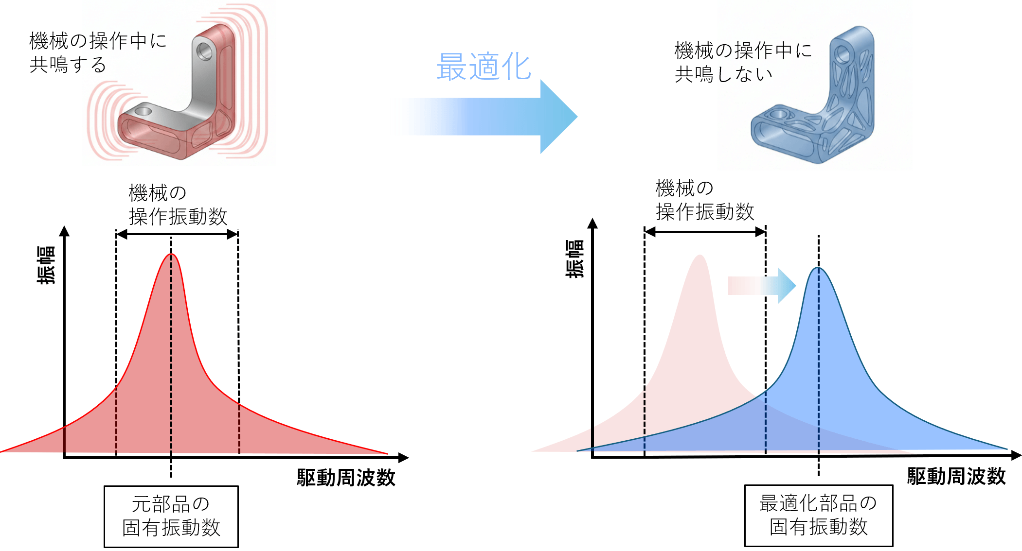 部品の固有振動数が、稼働時の周波数(モーターの回転数など)と一致して「共振」を起こすと、パフォーマンスの著しい低下や疲労破壊に繋がります。そこで近年、固有振動数(固有値)をコントロールする構造最適化技術が注目されています。