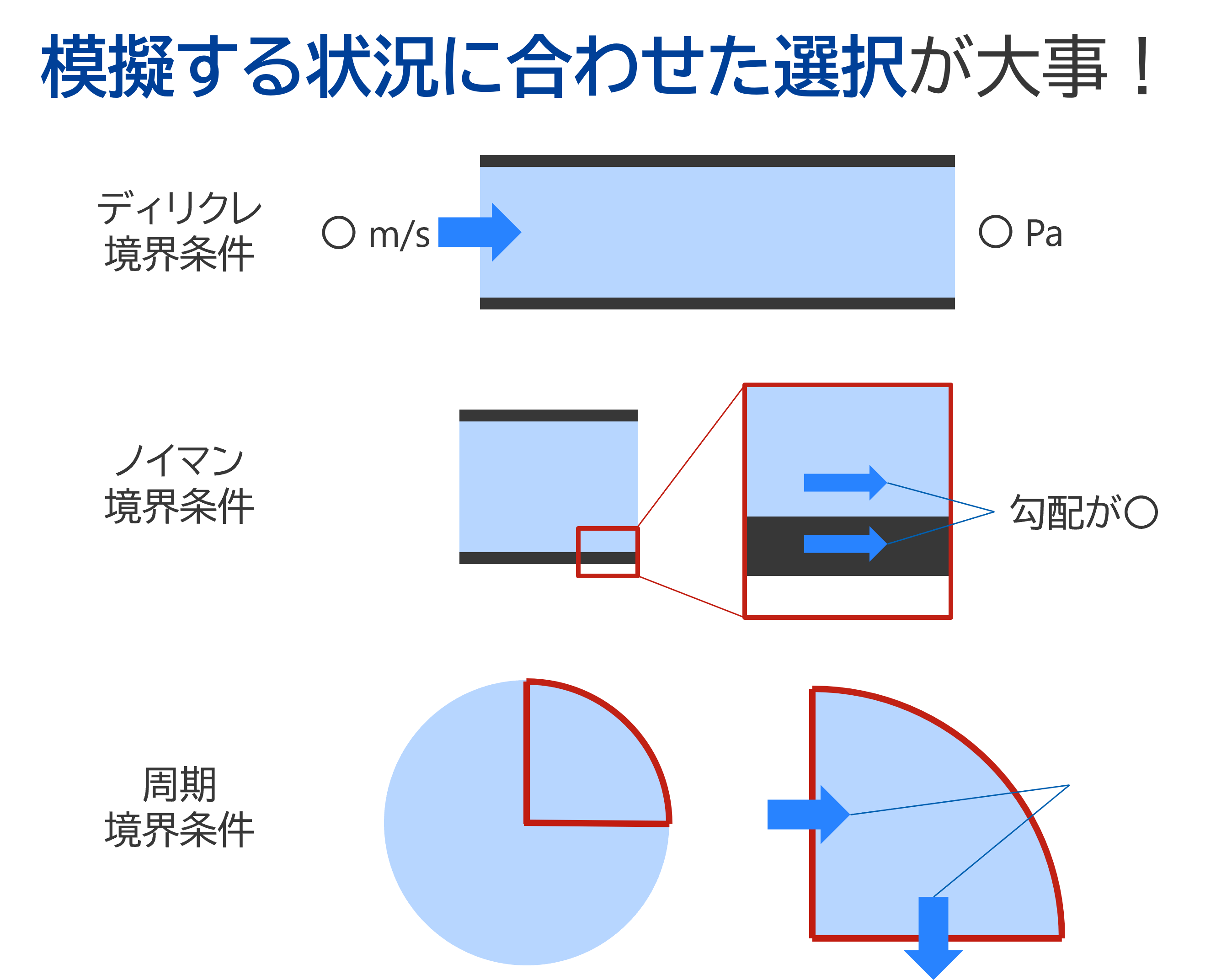境界における値をそのまま指定する方法がディリクレ境界条件と呼ばれる方法です。速度〇m/sや圧力〇Pa等がこの条件にあたります。