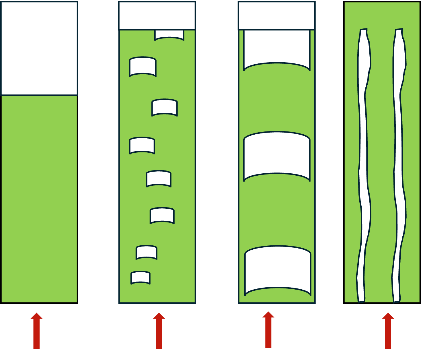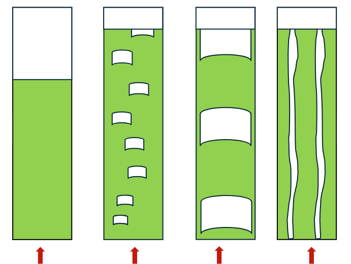 次に粉体層の流動化後について紹介します。粉体の粒径や密度によって流動状態が異なってきます。ここでは緑色を粉体層、白色を流体領域とし、4つの代表的な流動化状態について示します。それぞれの下側から流体を流入させていて、流動状態は左側から固定層、バブリング、スラッギングとチャネリングと呼ばれています。最小流動化速度より流速が小さければ、固定層となります。