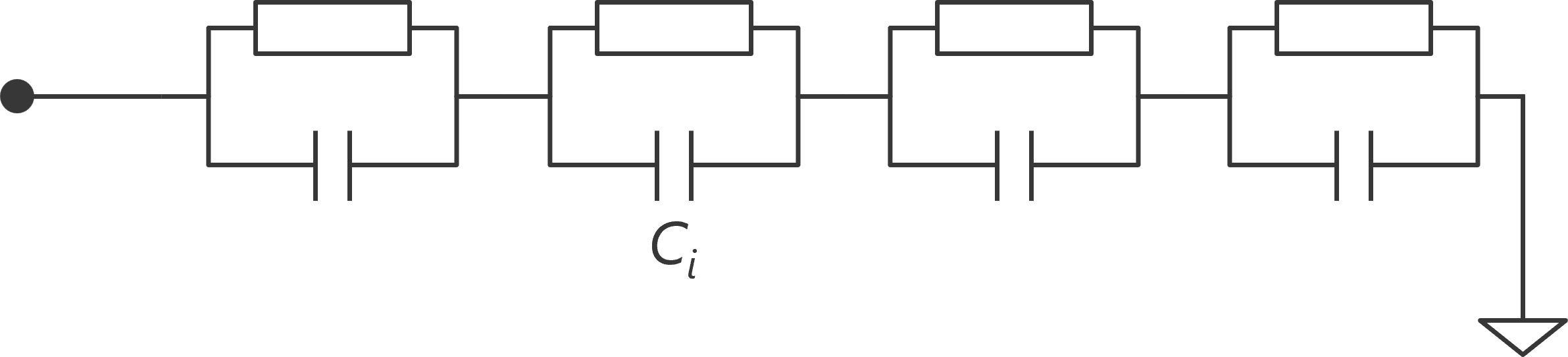 時定数スペクトルR(τ)の各ピークから、熱抵抗Rと熱容量Cのペアを特定し、それらが直列に並んだFoster(フォスター)回路を作成します(図2)。これは数学的には温度変化を再現できる回路モデルですが、素子の実際の内部構造とは一致していません。
