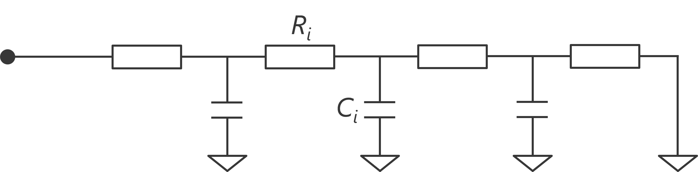 Foster回路をジャンクションから順に伝熱する形のCauer(カウアー)回路へ変換します(図3)。この変換によって、回路上の熱抵抗Rと熱容量Cが、ジャンクション、ダイ、はんだ、基板といった形で、内部構造に対応した順番に並びます。