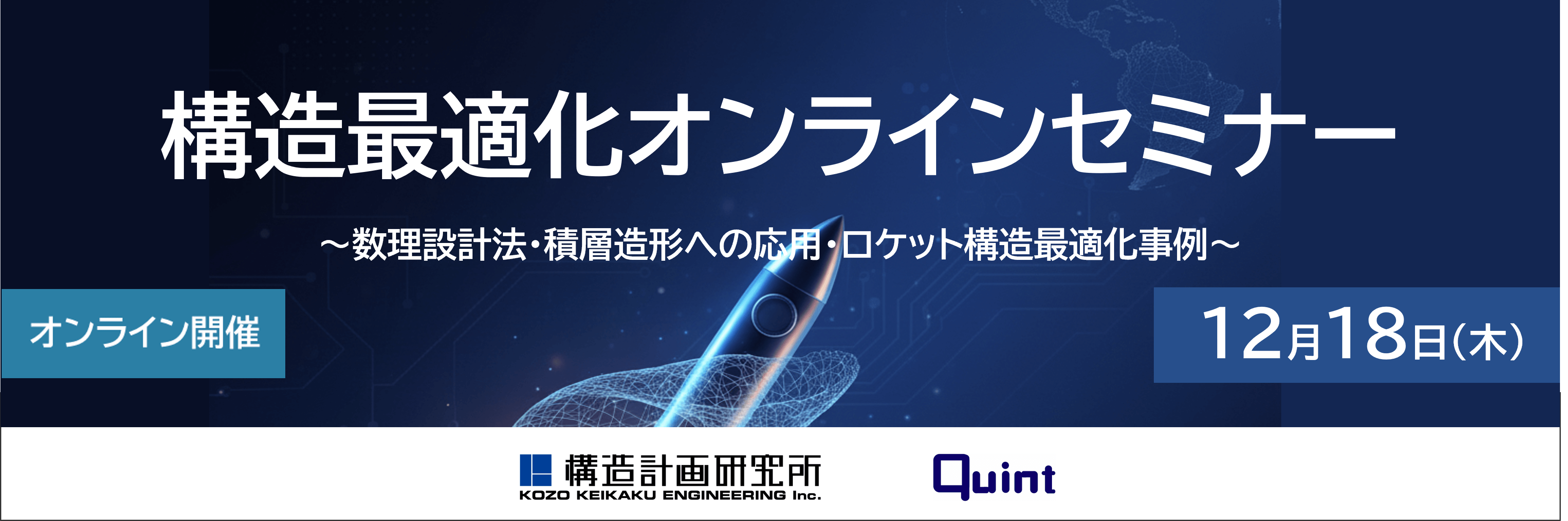 構造計画研究所からはトポロジー最適化が搭載された構造最適化シミュレーションHiramekiWorksのご紹介、開発元くいんと社からは固有値オプションを含む最新機能のご紹介をいたします。